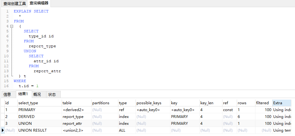UNION:UNION 中的第二个或以后的 SELECT 语句,下图中report_attr为union后的(即union中的第二个),select_type显示为UNION。