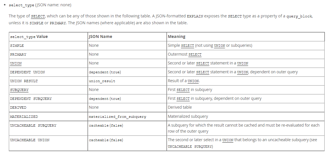 查询的类型,取值可以是SIMPLE、PRIMARY、UNION、DEPENDENT UNION、UNION RESULT、SUBQUERY、DEPENDENT SUBQUERY、DERIVED、MATERIALIZED、UNCACHEABLE SUBQUERY、UNCACHEABLE UNION。