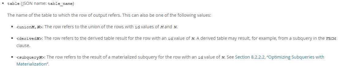 所引用的表名称,当为衍生表时,值为<derived+衍生表id>,如:<derived2>;当为联合结果集时值为<union+union第一个表id,union第二个表id>,如:<union2,3>