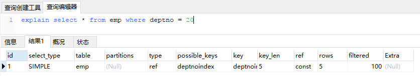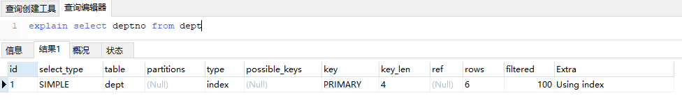 也就是说当查询的结果在索引树中都存在的话不需要全表扫描,效率会比ALL快些,Extra列中显示Using index。