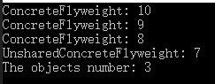// 客户端代码 #include<iostream> #include"concreteflyweight.hpp" #include"unsharedconcreteflyweight.hpp" #include"flyweightfactory.hpp" using namespace std; int main(){ int extrinsicState = 10; FlyweightFactory* fwFactory = new FlyweightFactory(); Flyweight* fw1 = fwFactory->getFlyweight("#1"); Flyweight* fw2 = fwFactory->getFlyweight("#2"); Flyweight* fw3 = fwFactory->getFlyweight("#3"); fw1 = fwFactory->getFlyweight("#1"); fw1->myOperation(extrinsicState--); fw2->myOperation(extrinsicState--); fw3->myOperation(extrinsicState--); UnsharedConcreteFlyweight* ufw = new UnsharedConcreteFlyweight(); ufw->myOperation(extrinsicState--); cout << "The objects number: " << fwFactory->getCnt() << endl; getchar(); return 0; }