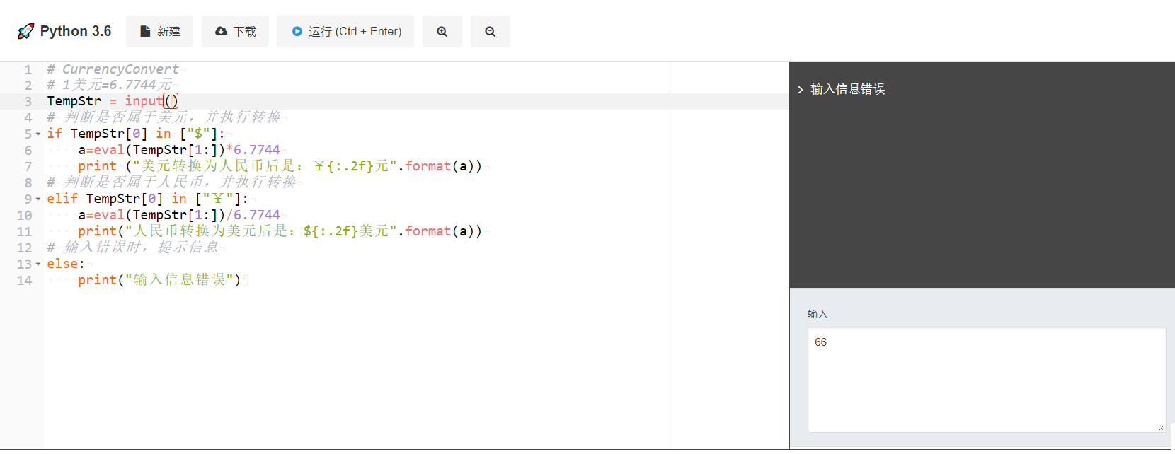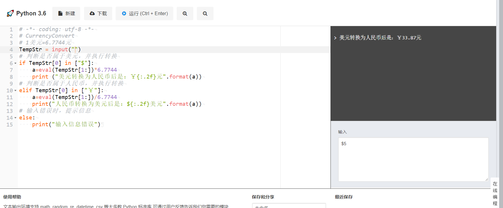 例1: 输入一个美元货币值:$32.3 ,当输入美元时,返回“美元转换为人民币后是:¥32元”
