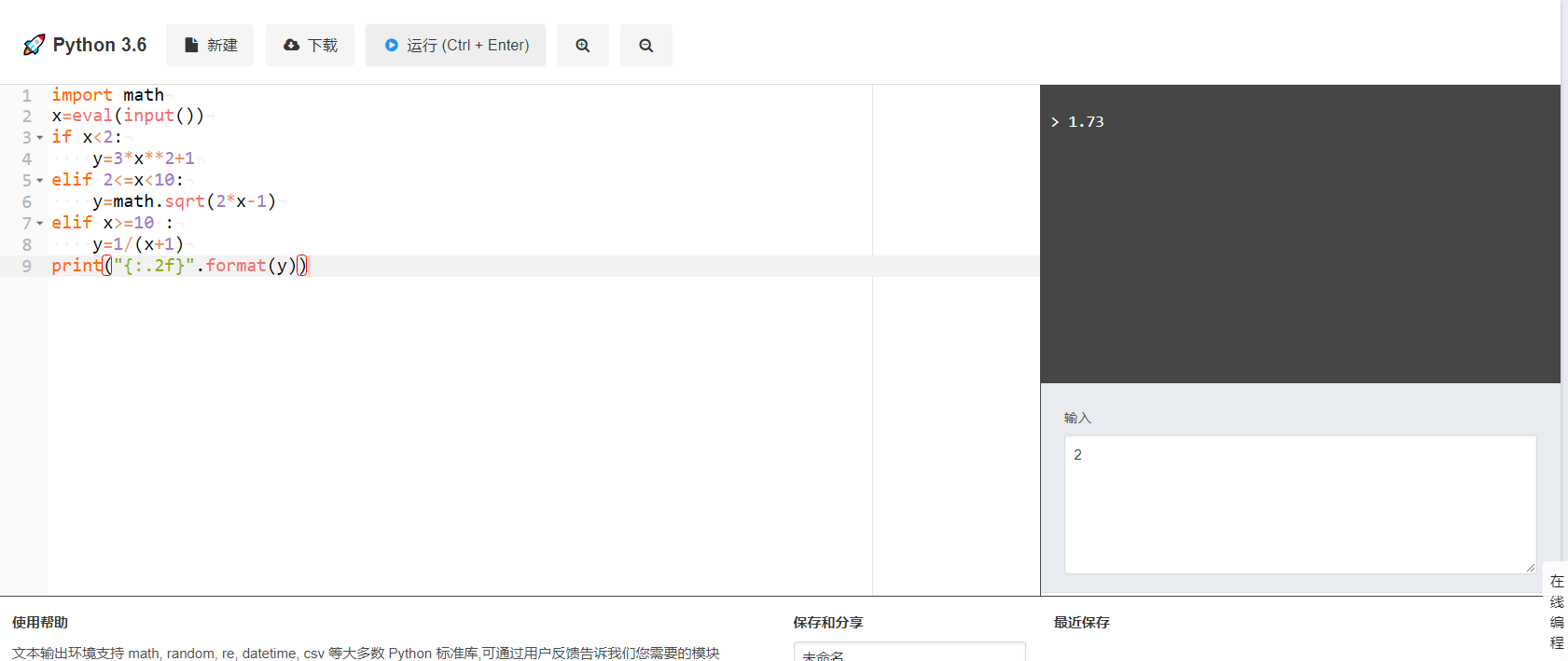 从键盘输入x的值,根据公式计算并输出x和y的值