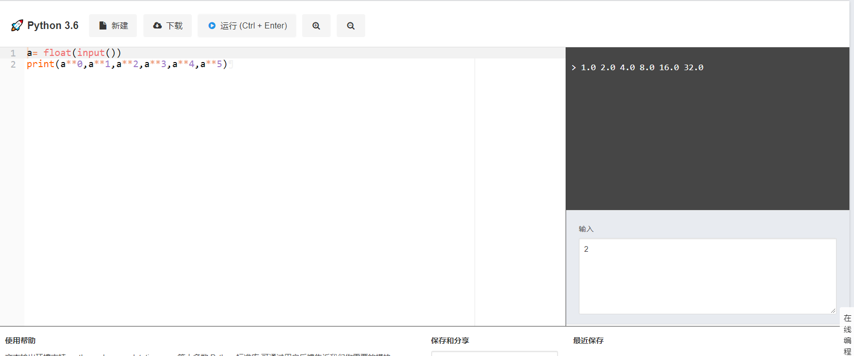 编写一个程序,计算输入数字N的0次方到5次方结果,并依次输出这6个结果,输出结果间用空格分隔。其中:N是一个浮点数。