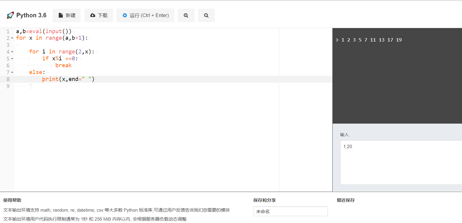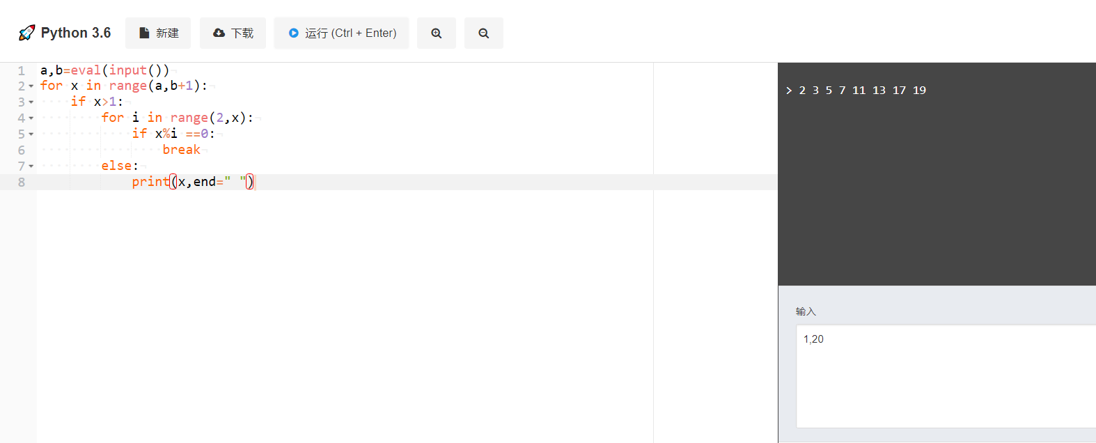 编程实现输出指定范围内的素数,输入以逗号间隔,输出以空格间隔。指定范围由用户输入指定。