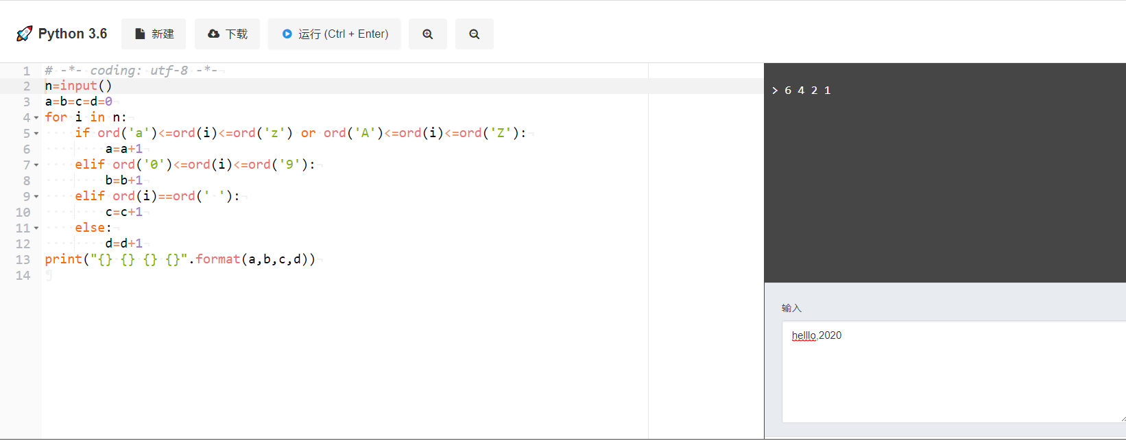 输入语句里面,数字,符号的形式不同,不能直接进行比较,统计。但是可以用ord()将每个字符转换为数字的大小,字母的边界就是a,z,数字的边界就是0,9,