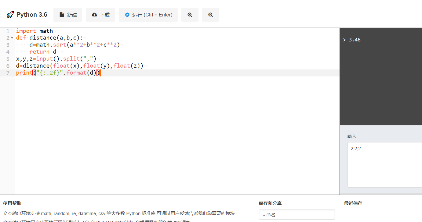 print("{:.2f}".format(d))#输出距离值,保留三维小数