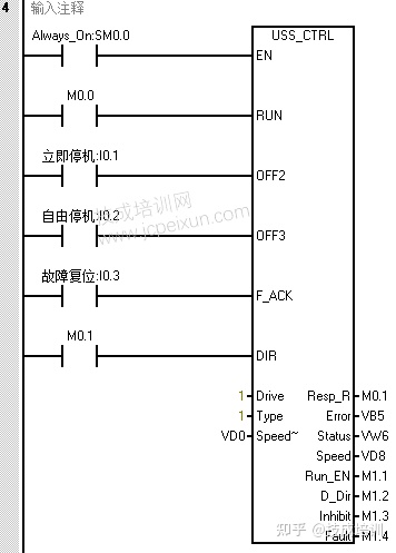 第七步:(M0.3首次接通读取变频器输出电流,SM0.5用轮询方式循环读取变频器输出电流、读取变频器输出电流值并存入VD14里面,读取完后完成标志位M0.4接通)