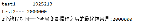 # 多线程共享全局变量 import threading import time num = 0 def test1(): global num for i in range(1000000): mutex.acquire() # 上锁 num += 1 mutex.release() # 解锁 print('test1-----', num) def test2(): global num for i in range(1000000): mutex.acquire() # 上锁 num += 1 mutex.release() # 解锁 print('test2---', num) if __name__ == '__main__': # 创建一个互斥锁 # 默认是未上锁的状态 mutex = threading.Lock() t1 = threading.Thread(target=test1) t2 = threading.Thread(target=test2) t1.start() t2.start() while len(threading.enumerate()) != 1: time.sleep(1) print("2个线程对同一个全局变量操作之后的最终结果是:%s" % num)