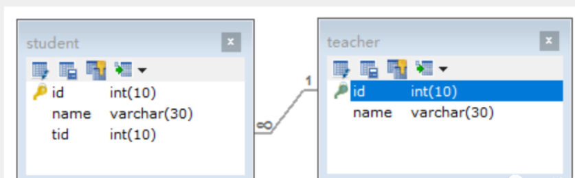 CREATE TABLE `teacher` ( `id` INT(10) NOT NULL, `name` VARCHAR(30) DEFAULT NULL, PRIMARY KEY (`id`) ) ENGINE=INNODB DEFAULT CHARSET=utf8 INSERT INTO teacher(`id`, `name`) VALUES (1, '秦老师'); CREATE TABLE `student` ( `id` INT(10) NOT NULL, `name` VARCHAR(30) DEFAULT NULL, `tid` INT(10) DEFAULT NULL, PRIMARY KEY (`id`), KEY `fktid` (`tid`), CONSTRAINT `fktid` FOREIGN KEY (`tid`) REFERENCES `teacher` (`id`) ) ENGINE=INNODB DEFAULT CHARSET=utf8 INSERT INTO `student` (`id`, `name`, `tid`) VALUES ('1', '小明', '1'); INSERT INTO `student` (`id`, `name`, `tid`) VALUES ('2', '小红', '1'); INSERT INTO `student` (`id`, `name`, `tid`) VALUES ('3', '小张', '1'); INSERT INTO `student` (`id`, `name`, `tid`) VALUES ('4', '小李', '1'); INSERT INTO `student` (`id`, `name`, `tid`) VALUES ('5', '小王', '1');