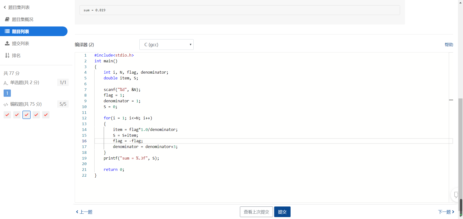 在一行中按照“sum = S”的格式输出部分和的值S,精确到小数点后三位。题目保证计算结果不超过双精度范围。