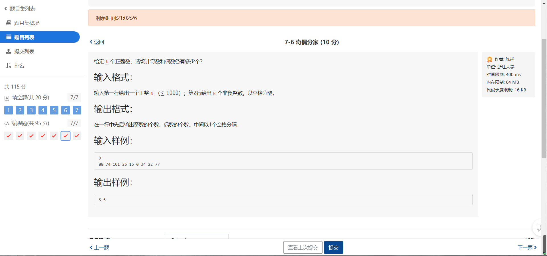 | 9 88 74 101 26 15 0 34 22 77 | 36 | 题目所给数据检验 |