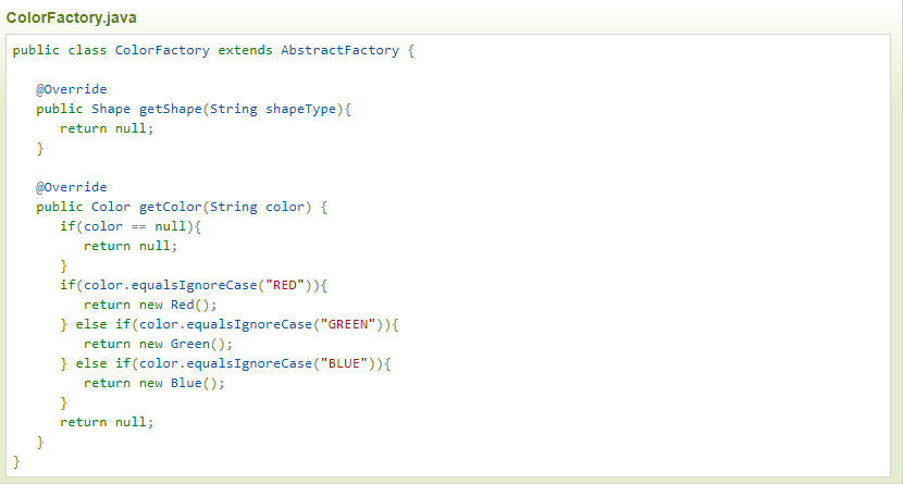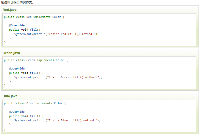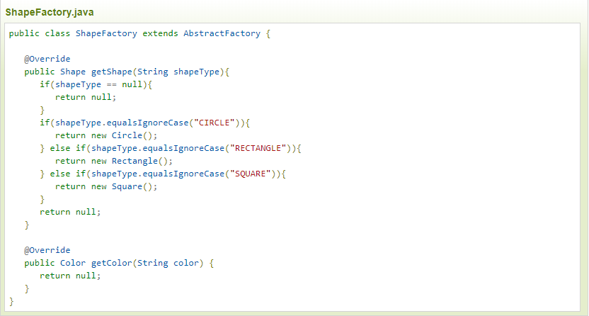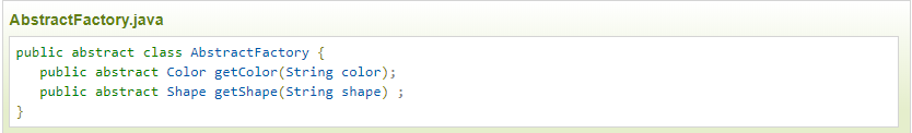 形状工厂(ShapFactory)和颜色工厂(ColorFactory)继承该抽象类,并实现相应的方法,如下: