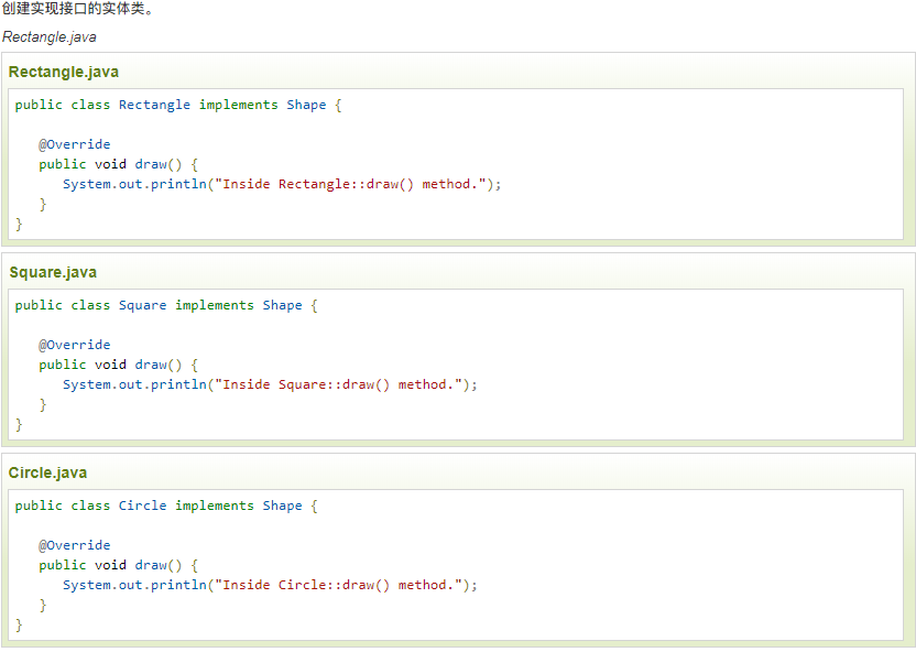 上面这句话,有些人不怎么理解,我給大家解释一下,打个比方说,你要在这个工厂创建三个对象,原本只是创建两个对象的,那么你就要在抽象方法中添加一个创建对象的方法,那么所有实现了这个接口的类都是要重新添加这个创建对象的方法,这就是对之前的工厂有影响的原因。