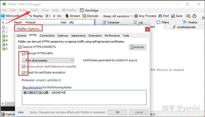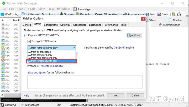 2.打开fiddler>Tools>Fiddler Options>HTTPS>…from remote clients only,勾选这个选项就可以了