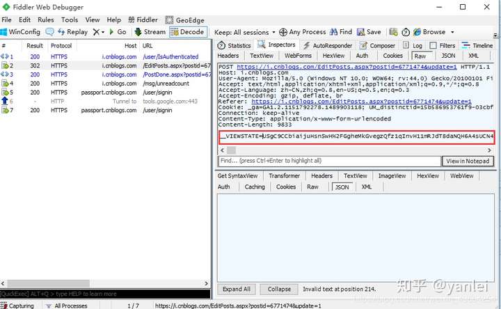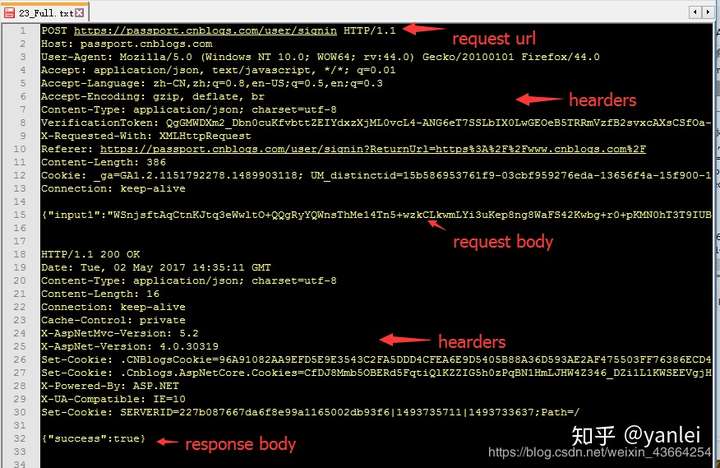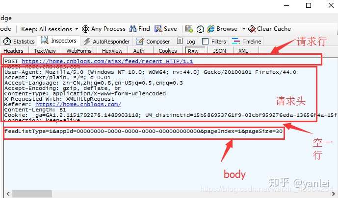 2.下图是fiddler工具抓的post请求报文(工具使用看fiddler篇),可以对照上图,更清楚的理解http的请求报文内容。