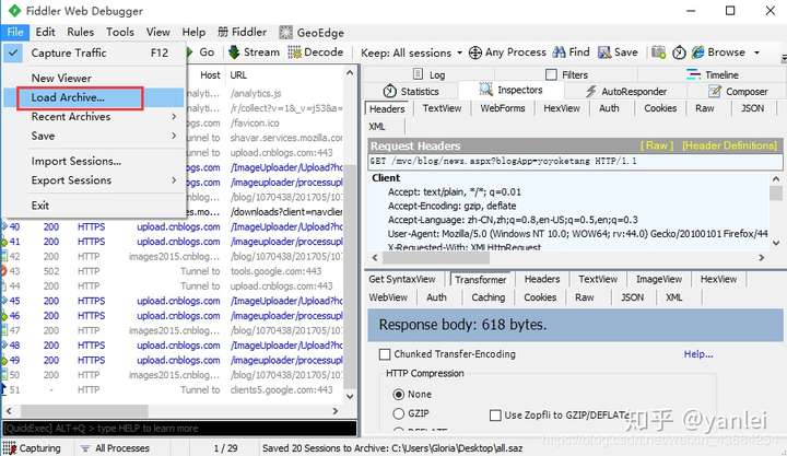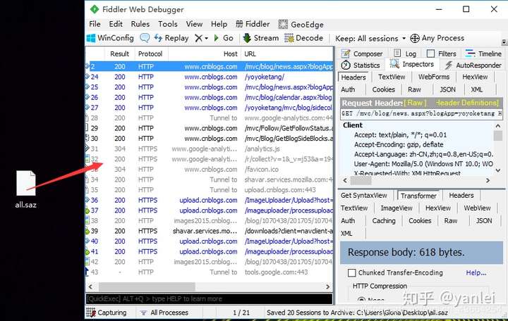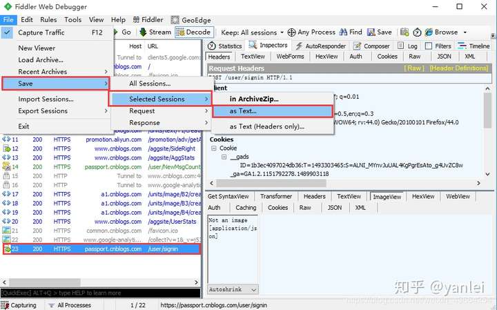 - 我们可以打开fiddler,操作完博客园后,选中save>All Sessions,保存全部会话