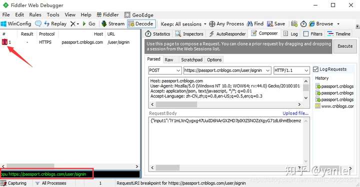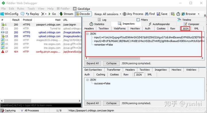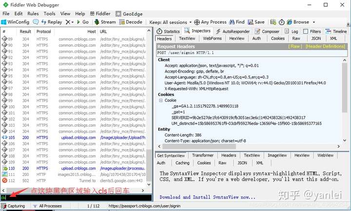 在点击登录按钮的时候,不要做多余的操作了,然后查看fiddler会话框,这时候有好几个请求。