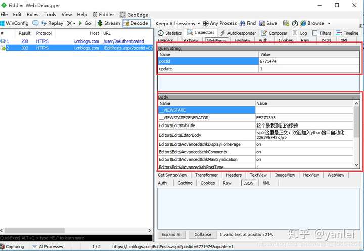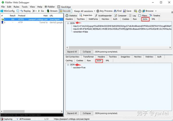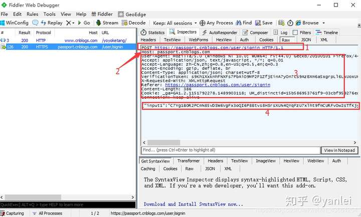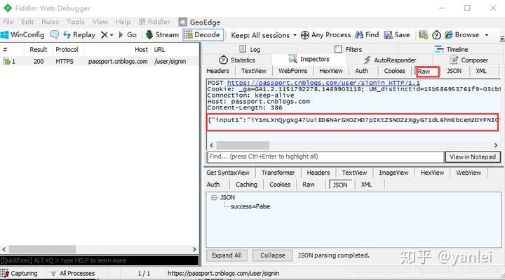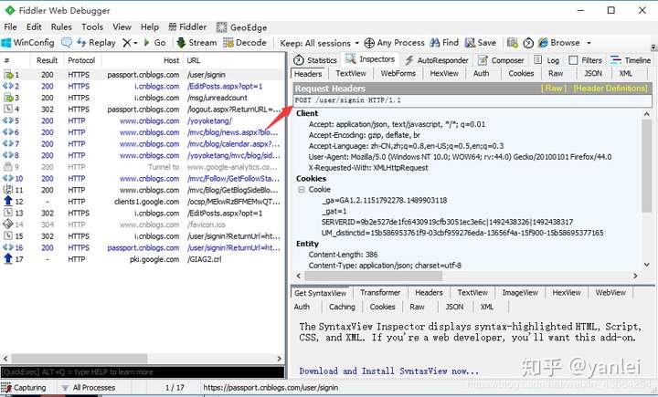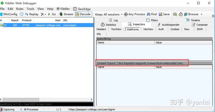 2.输入账号和密码登录成功后,查看fiddler抓包的请求头信息,可以看出是post请求