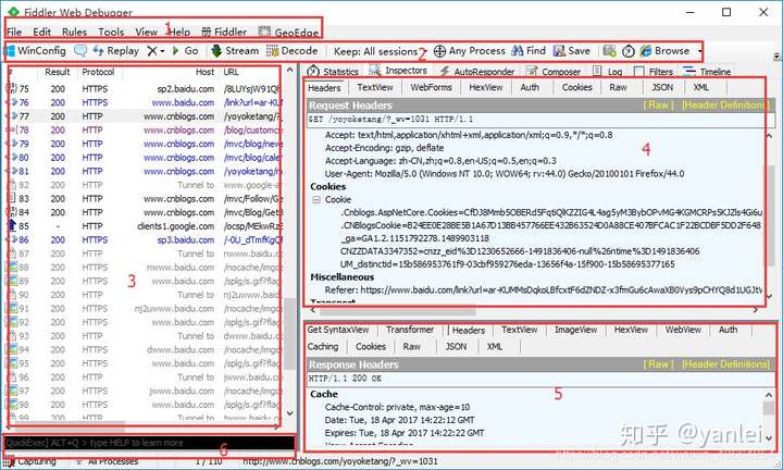 本篇简单的介绍下fiddler界面的几块区域,以及各自区域到底是干什么用的,以便于更好的掌握这个工具