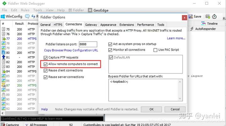 1.fiddler>Tools>Fiddler Options>Connections 勾选Allow remote computers to connect。