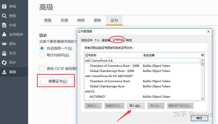 1.打开右上角浏览器设置》选项》高级》证书》查看证书》证书机构》导入