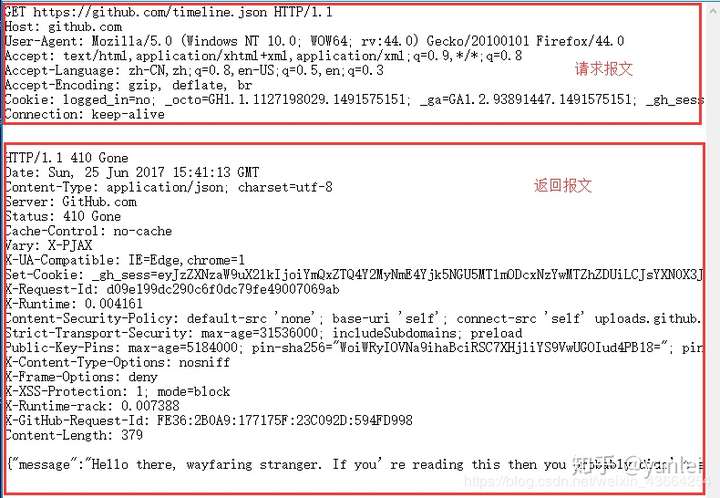 2.以下是请求https://github.com/timeline.json 这个地址后,用fiddler抓包导出为文本,查看完整的http请求内容。(具体操作查看《fiddler 1.10会话保存》)
