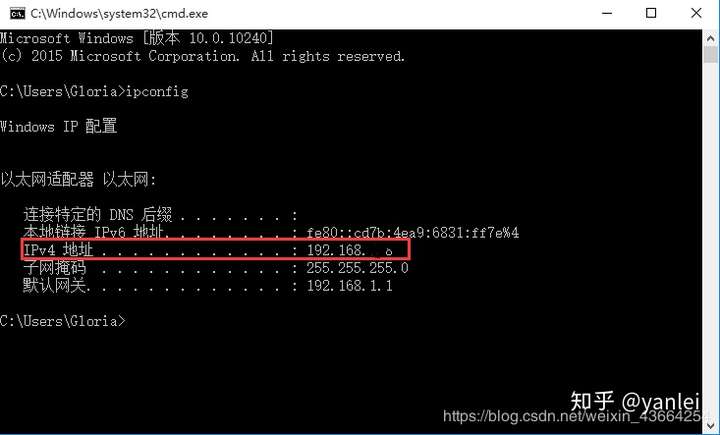 1.打开cmd,输入:ipconfig,记住这个IPv4地址。