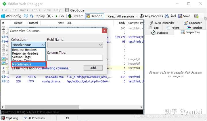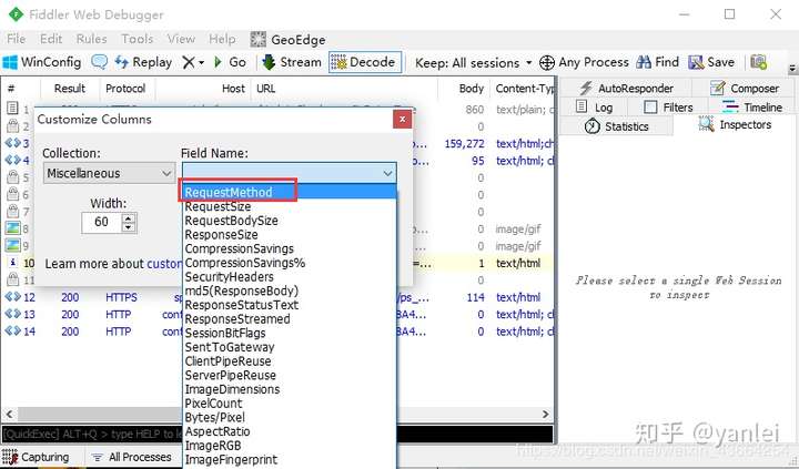 在使用fiddler抓包的时候,查看请求类型get和post每次只有点开该请求,在Inspectors才能查看get和post请求,不太方便。于是可以在会话框直接添加请求方式。