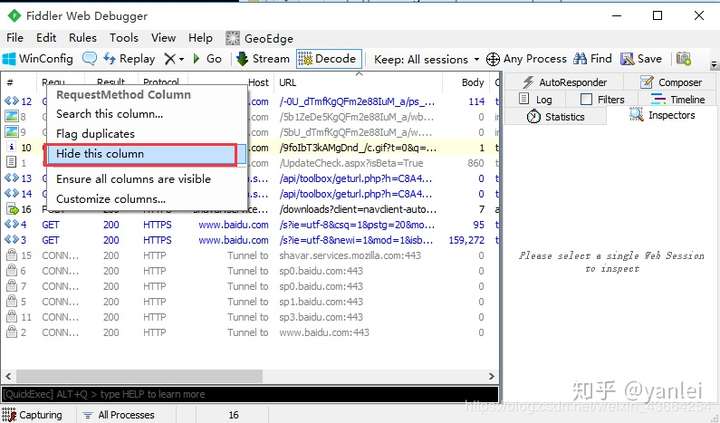 1.打开fiddler后,左边会话框区域刷刷刷的很多请求,那么如何有效的找出自己需要的请求呢?