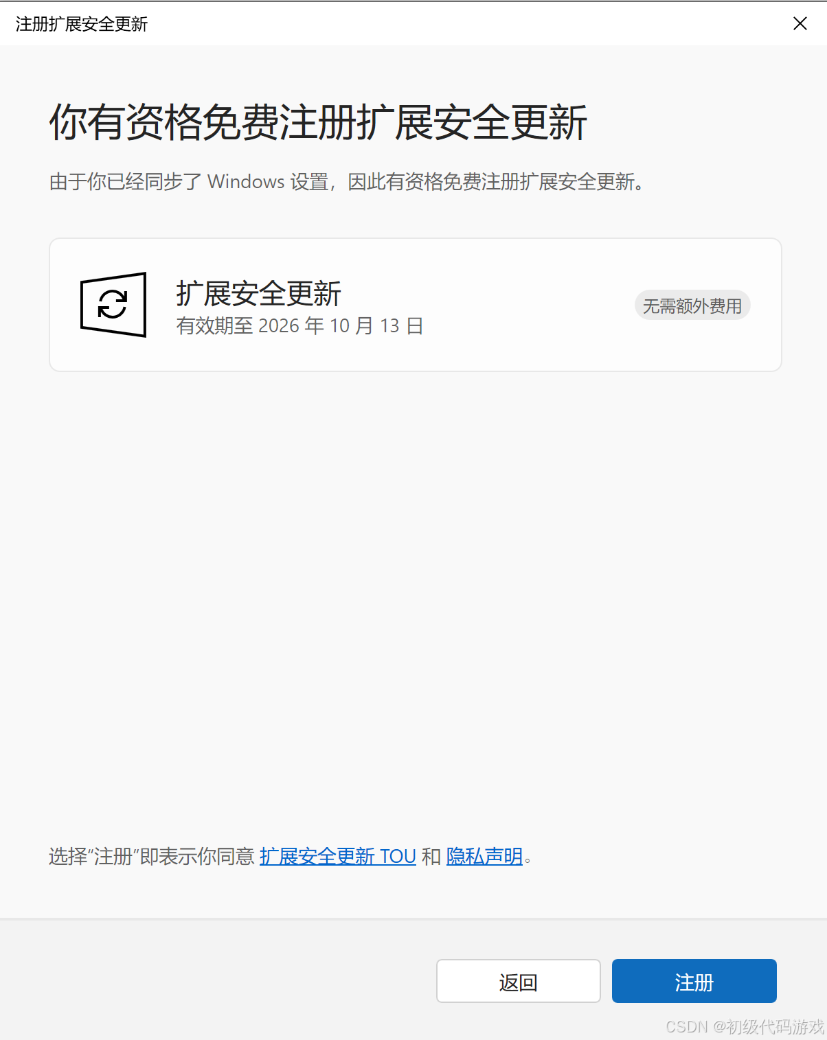 我有一个账号,拥有windows365(office365)的,尝试点击了一下注册竟然提示可以免费注册扩展安全更新。