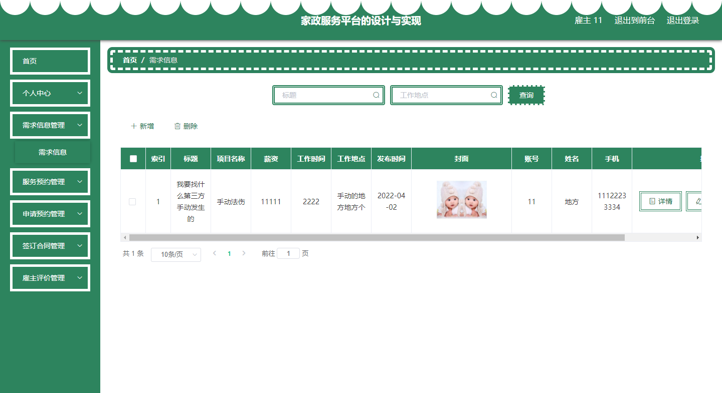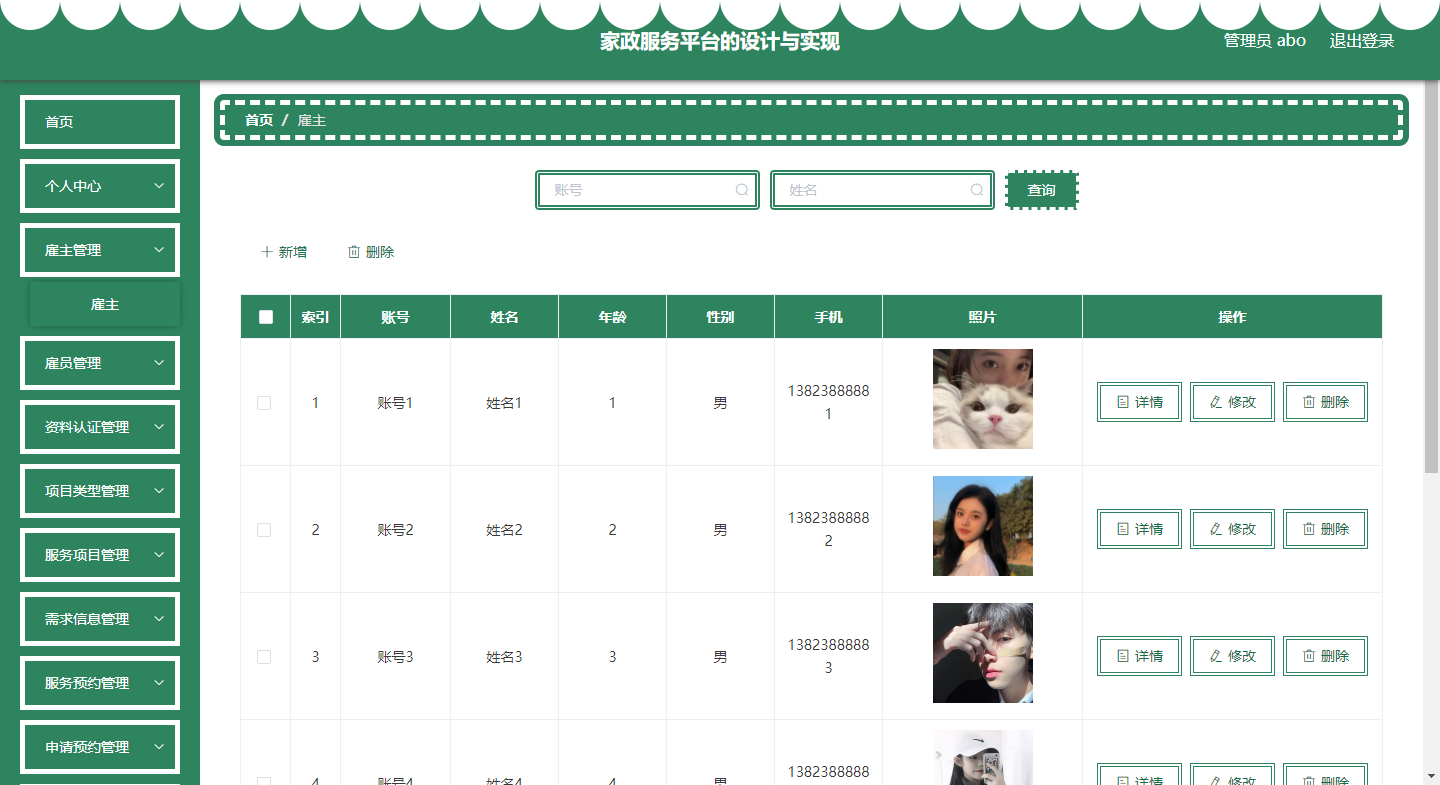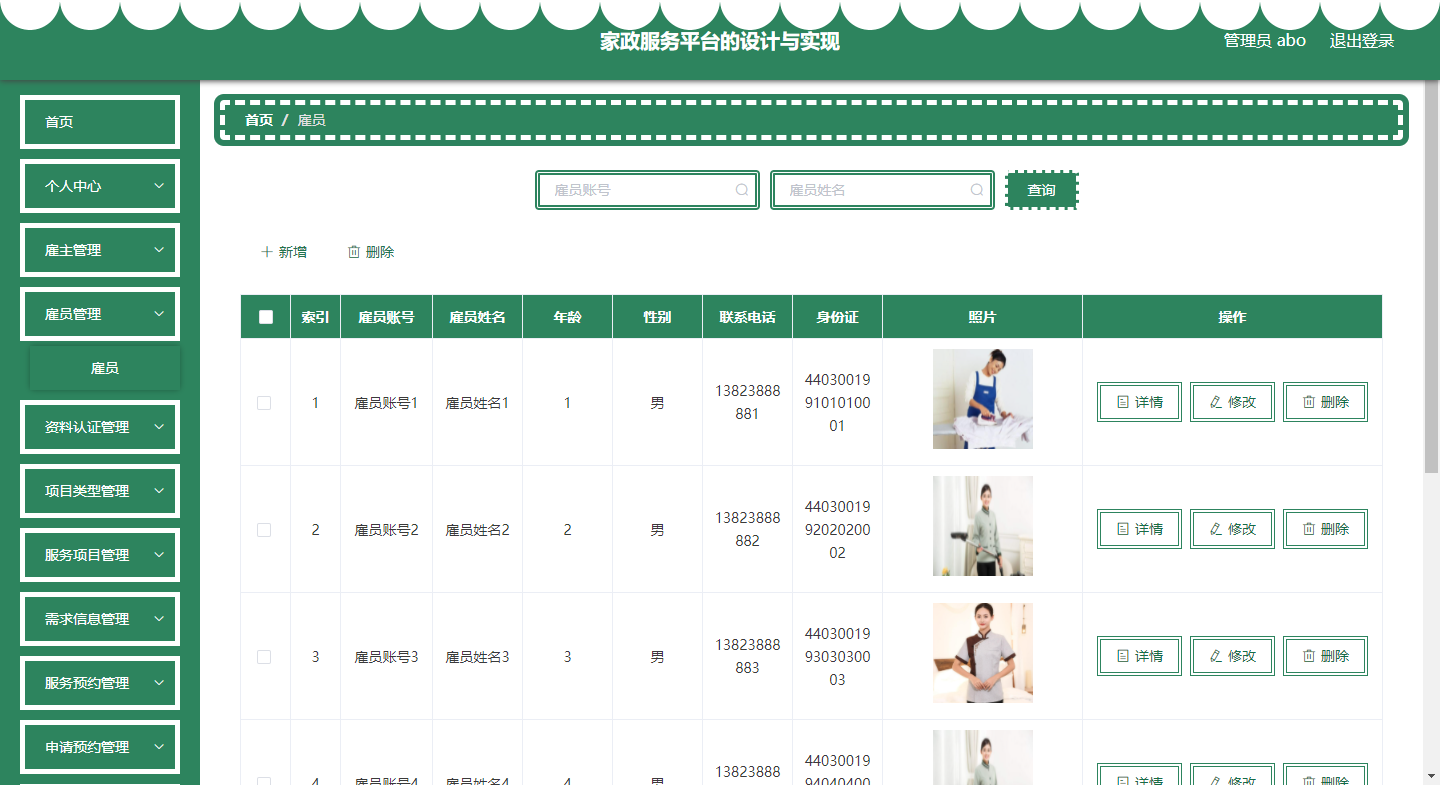 现代经济快节奏发展以及不断完善升级的信息化手艺,让传统数据信息的管理升级为软件存储,归纳,集中处理资料信息的管理方式。本家政服务平台就是在这样的大环境下诞生,其可以帮助管理者在短时间内处理完毕庞大的数据信息,使用这种软件工具可以援助管理人员提高事务处理效率,达到事半功倍的效果。此家政服务平台利用当下成熟完善的Spring Boot框架,应用跨平台的可开发大型商业网站的Java语言,以及最受欢迎的RDBMS应用软件之一的MySQL数据库进行程序开发。家政服务平台有管理员,雇主,雇员三个角色。管理员能力有个人中心,雇主管理,雇员管理,资料认证管理,项目类型管理,服务项目管理,需求信息管理,服务预约管理,申请预约管理,签订合同管理,雇主评价管理,留言板管理,系统管理。雇主可以发布需求,雇员可以申请预约,雇主支付报酬,雇主和雇员可以签订合同,雇主能够对雇员进行评价。家政服务平台的开发根据操作人员需要设计的界面简洁美观,在功能模块布局上跟同类型网站保持一致,程序在实现基本要求功能时,也为材料信息面临的安全难题提供了一些实用的解决方案。允许说该程序在帮助管理者高效率地处理工作事务的同时,也实现了信息信息的整体化,规范化与自动化。