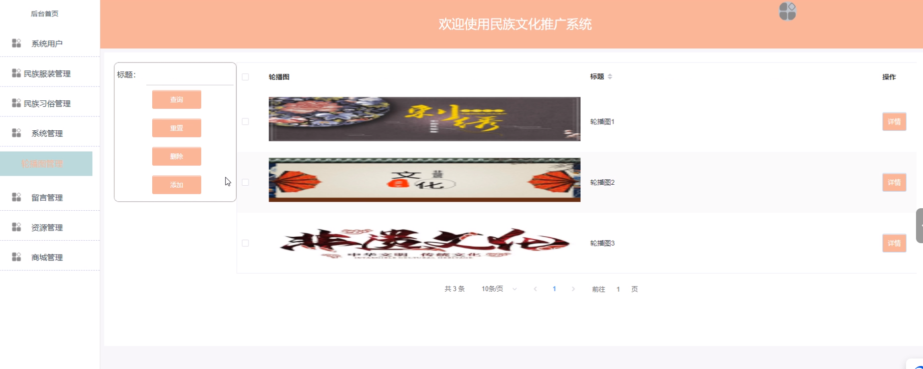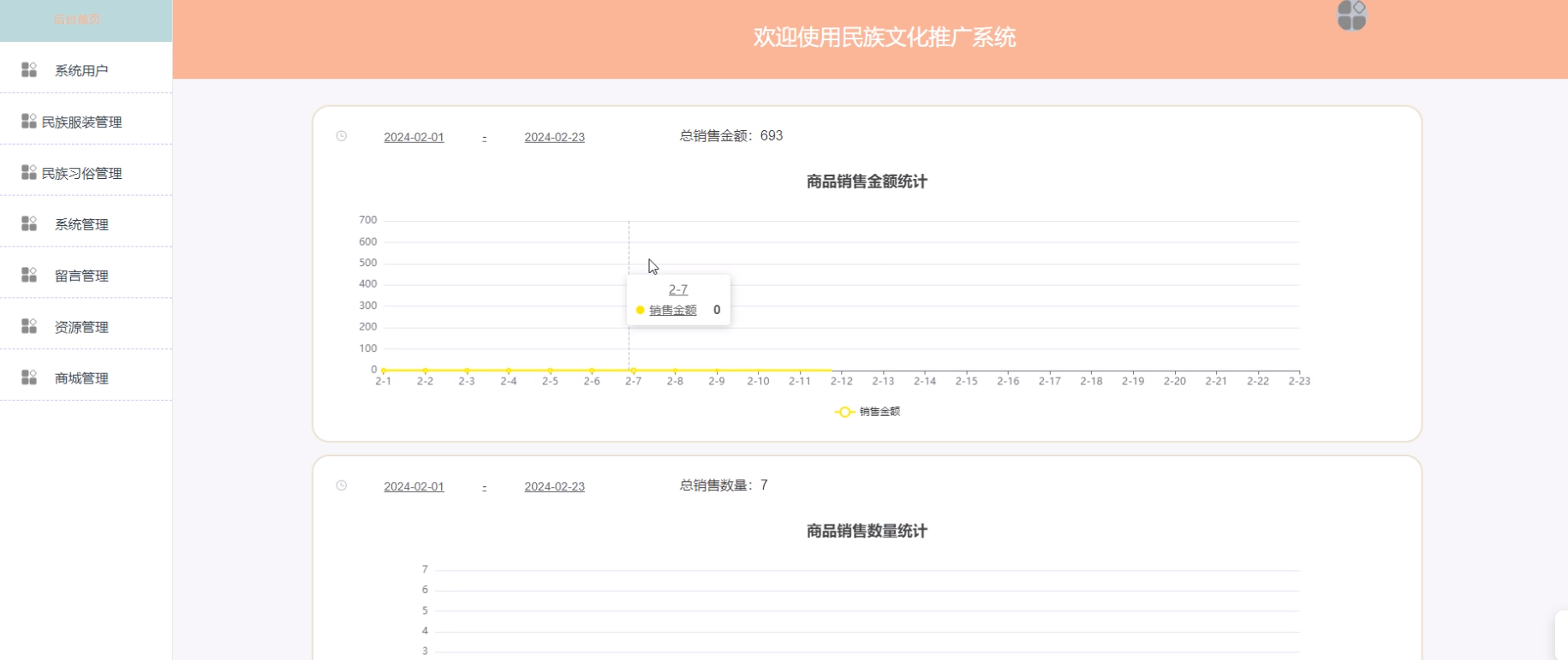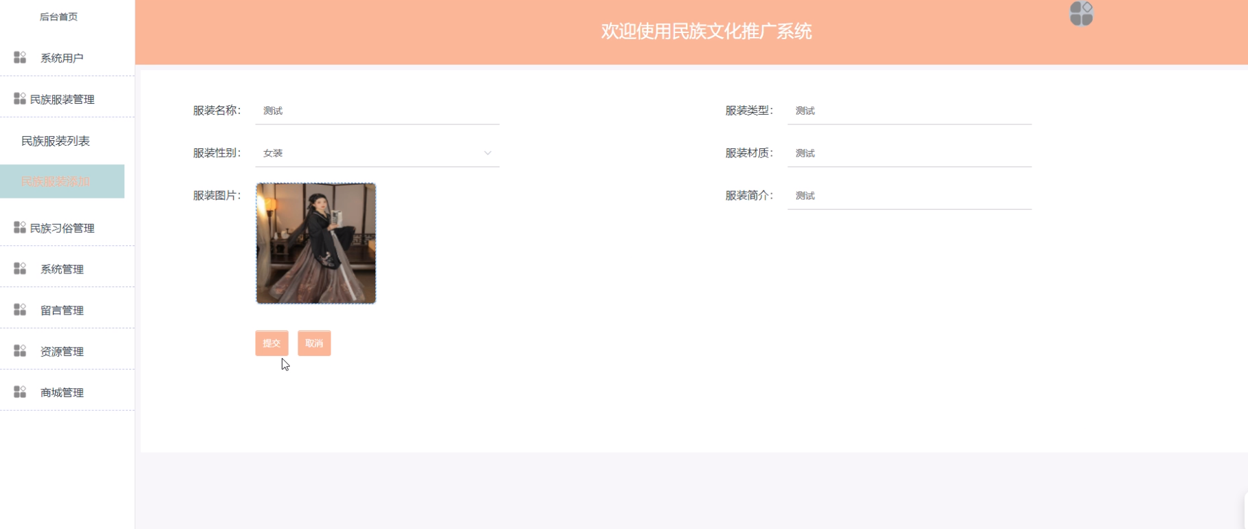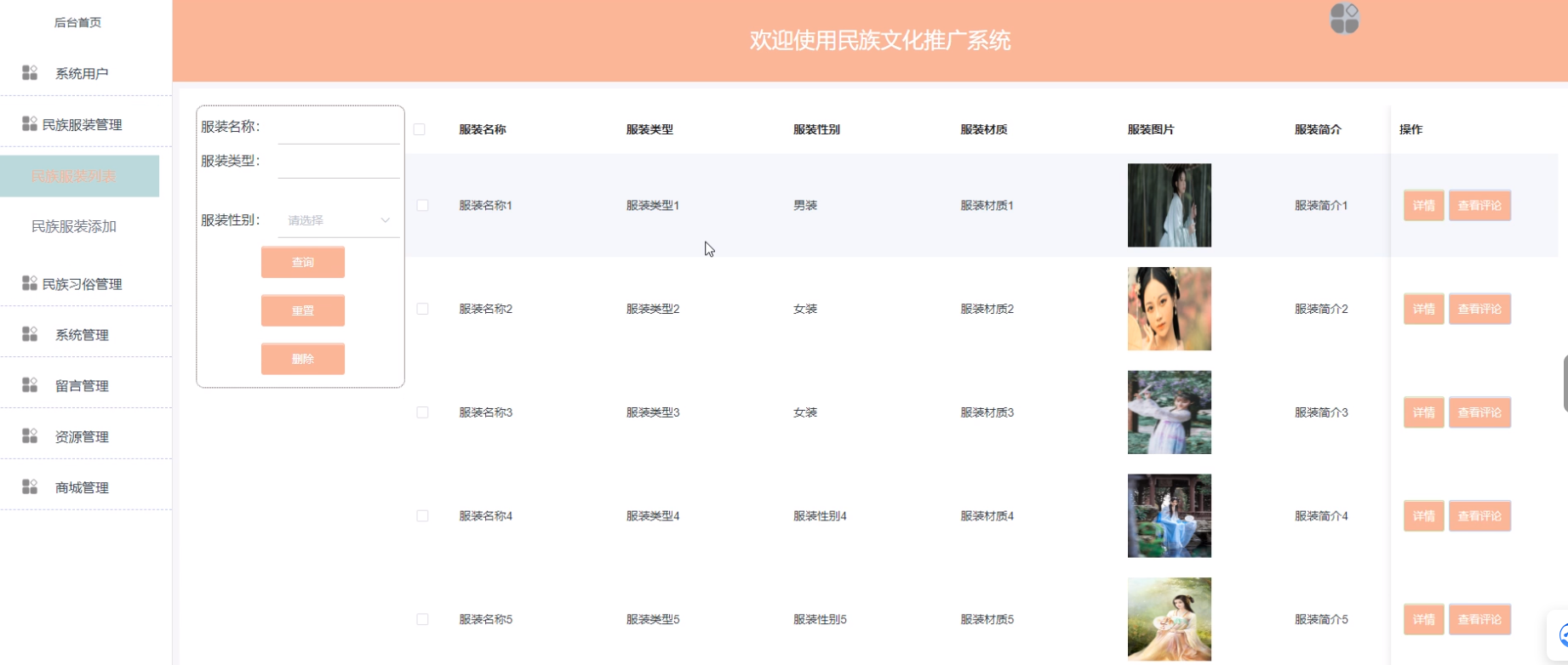 - 通过民族服装管理:发布和管理各民族的传统服装信息,包括服装的图片、描述、价格等。管理员能够添加、编辑和删除服装信息,确保信息的准确性和完整性。