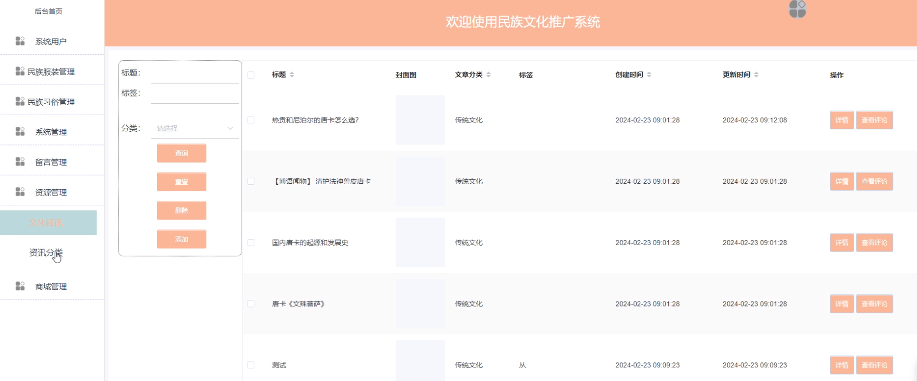 - 资源管理(文化资讯、资讯分类):发布和管理关于民族文化的资讯文章,如民族历史、民族艺术等。管理员可能对资讯进行分类管理,方便用户浏览和搜索。