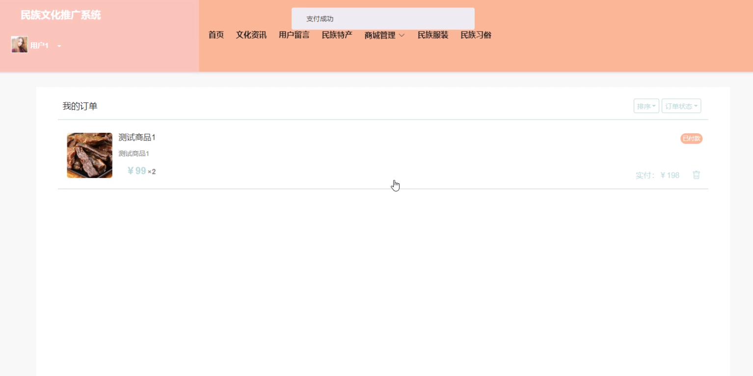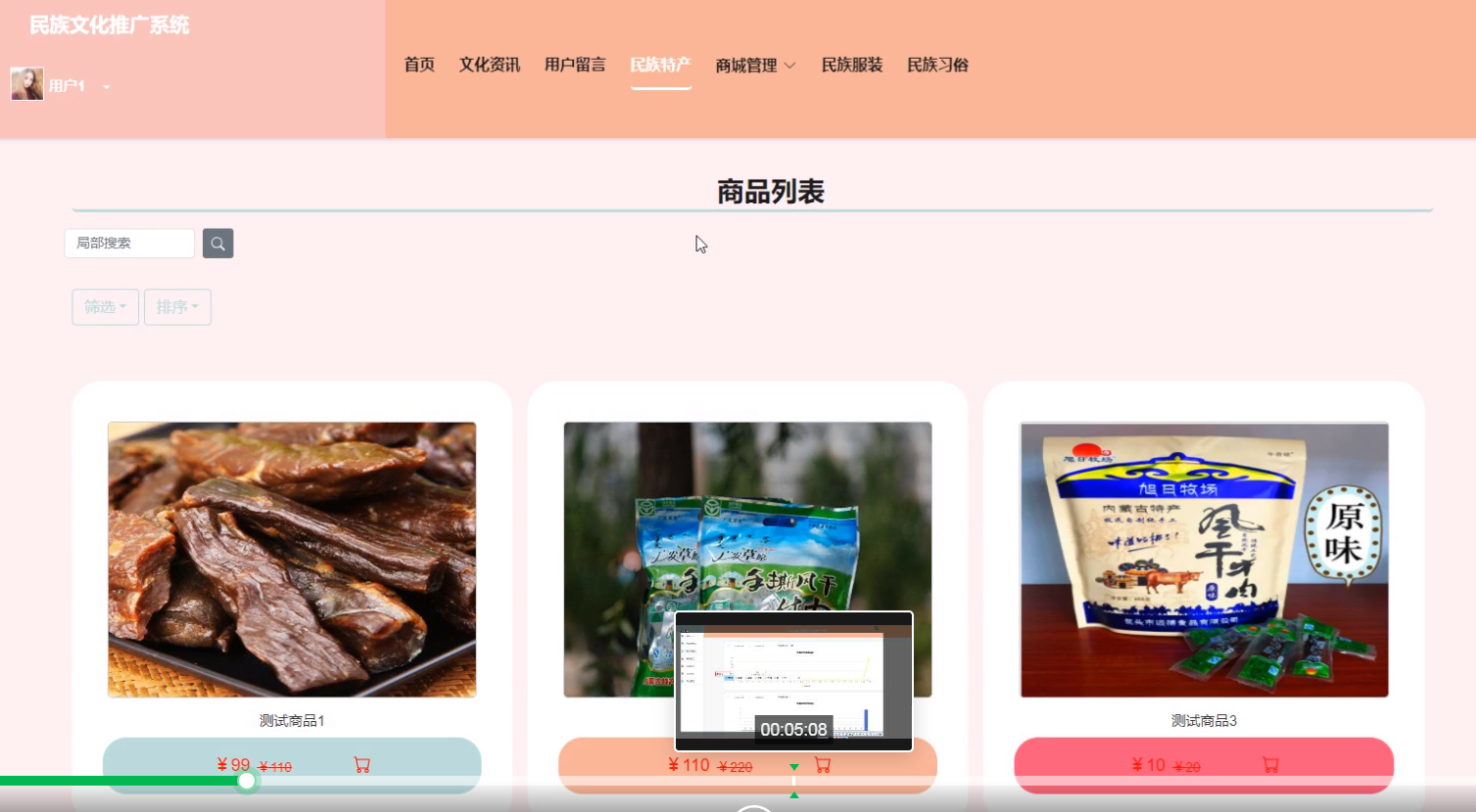 - 民族特产:展示各民族特有的特产商品,如手工艺品、食品等。用户可以查看特产的详细信息,并进行购买。