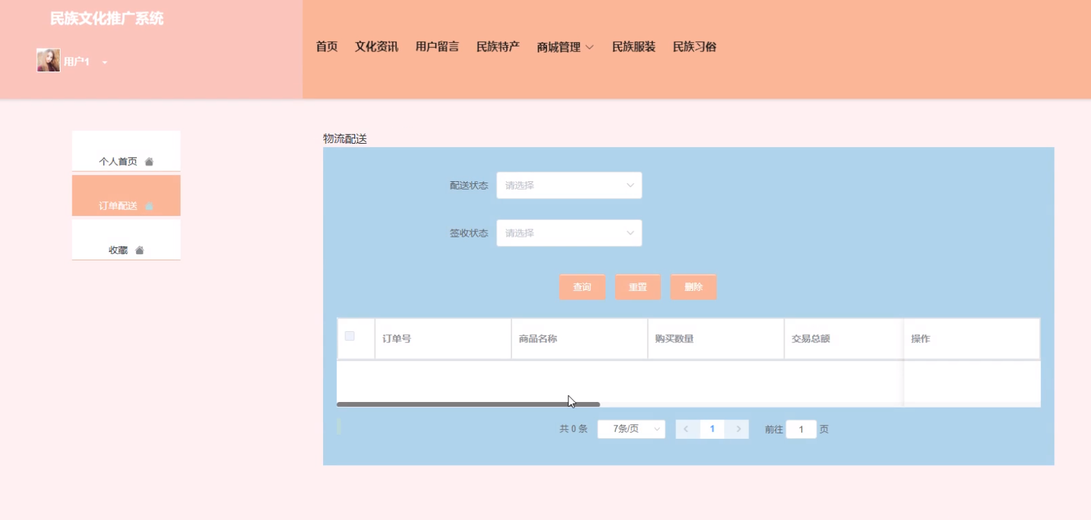 用户可以查看订单配送的详细信息,包括订单号、商品名称、购买数量、交易金额、等,可以对配送状态和签收状态进行查询和重置。订单配送界面如下图所示。