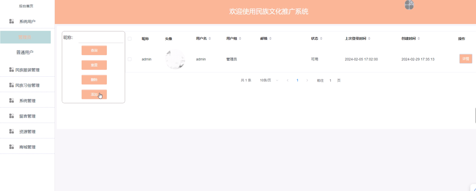 - 民族习俗管理:发布和管理各民族的传统节日、习俗等信息,让用户了解各民族的文化特色。管理员行定期更新习俗内容,保持信息的时效性。