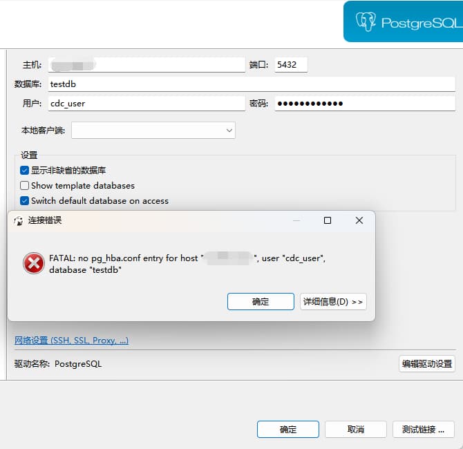 2025-08-30 15:20:53.300 CST [21383] FATAL: no pg_hba.conf entry for host "*.*.*.*", user "postgres", database "testdb"