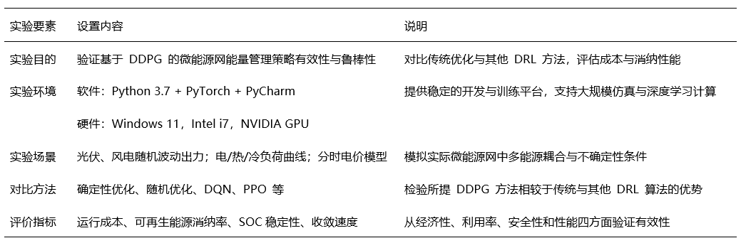 实验利用构建含光伏、风电、储能和多负荷的微能源网仿真场景,并在多种不确定性条件下对比不同优化方法,以评估 DDPG 策略在运行成本与可再生能源消纳方面的性能。