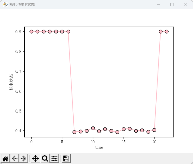 说明:该折线图反映了电池 SOC 的动态变化。SOC 在 0.9 与 0.4 之间波动,表明体系在保证电池不过度充放电的前提下,实现了灵活的能量调度。整体来看,SOC 变化与图 4 的充放电功率走势相呼应,验证了储能的协调控制效果。