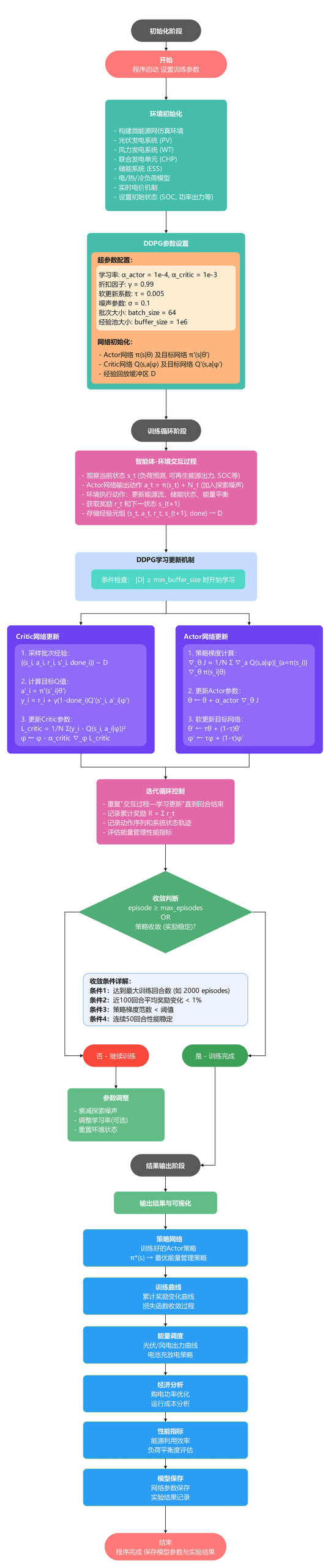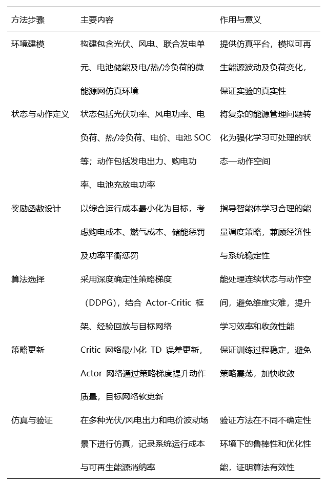 本研究基于深度确定性策略梯度(DDPG)算法构建微能源网能量管理模型,通过环境建模、状态与动作定义、奖励函数设计及策略迭代,实现对多能源平台的智能优化调度。