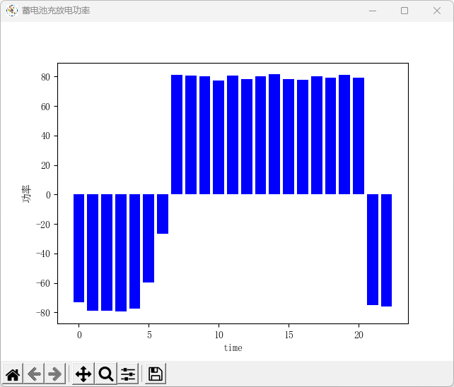 说明:该图展示了电池在不同时间段的充放电行为。初期阶段电池主要处于放电状态(负值),在中后期转为充电状态(正值),并在系统需要时再放电支撑负荷,体现了储能装置在削峰填谷、平衡波动中的作用。