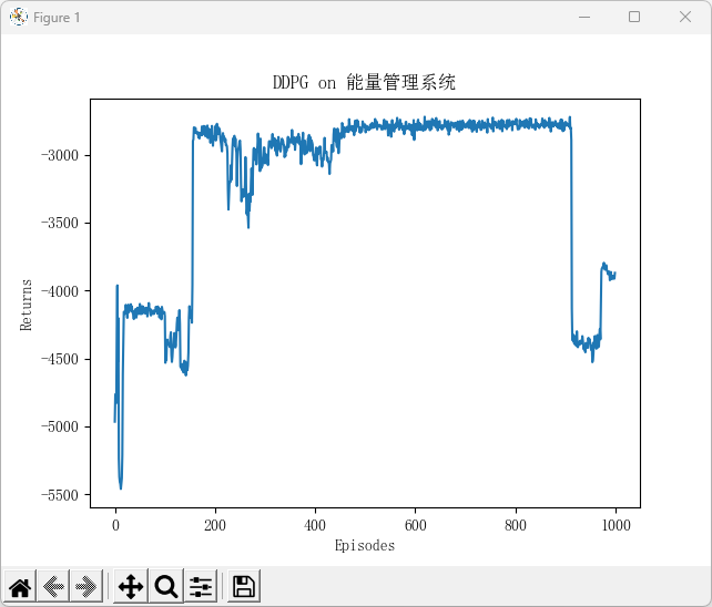 通过说明:该图展示了 DDPG 算法在微能源网能量管理任务中的训练过程。横轴为训练回合数,纵轴为累计回报。能够看到,初期回报值波动较大,随着训练的进行逐渐趋于稳定,说明智能体逐步学会了较优的能量调度策略。虽然在 800 回合附近出现一定回落,但整体收敛性能较好,验证了 DDPG 在连续状态与动作空间下的有效性。
