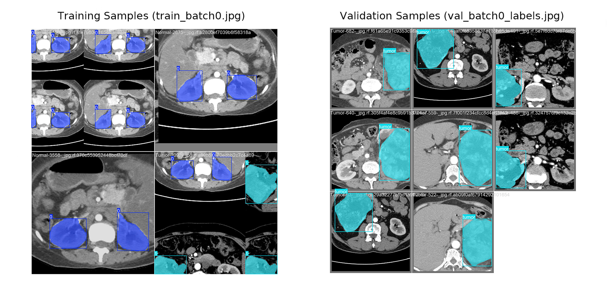 左图为训练集样本(train_batch0.jpg),展示了数据增强后的标注情况;右图为验证集样本(val_batch0_labels.jpg),展示了真实标注。蓝色区域为肾脏正常(类别 0),青色区域为肾脏肿瘤(类别 1)。