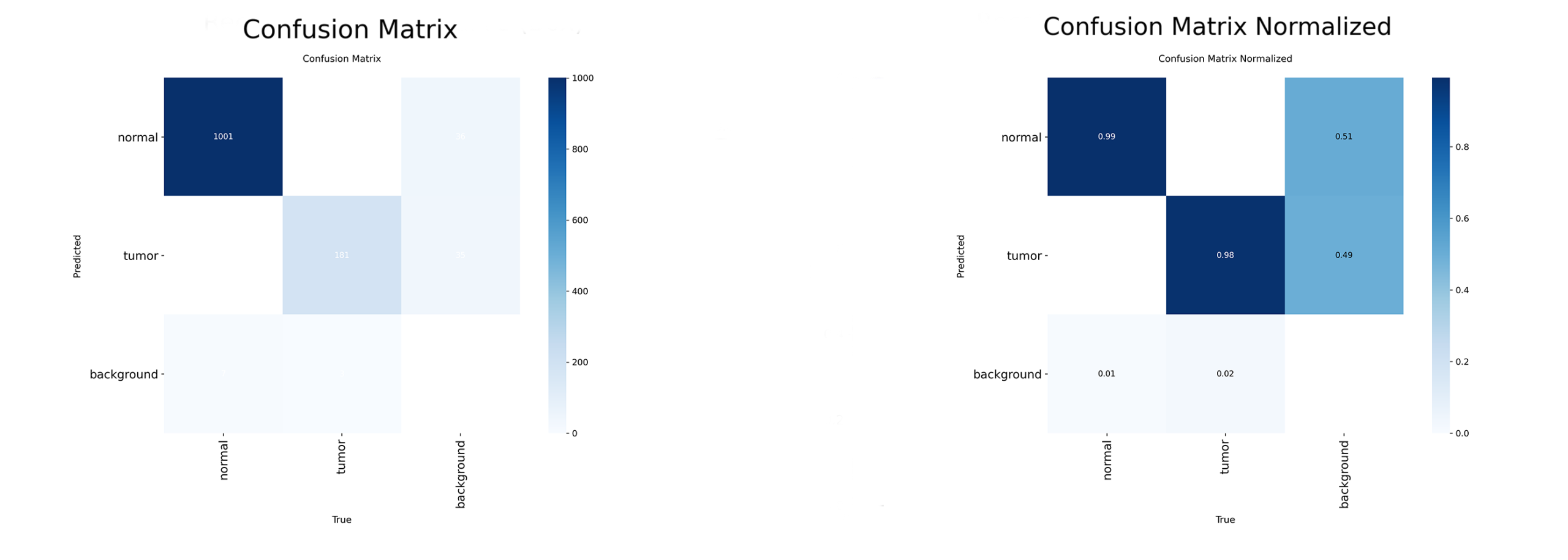 模型在该数据集上的分类和分割效果都非常优异,尤其是 normal 类几乎完美,tumor 类表现良好但有少量误判,需要关注类别不平衡问题。