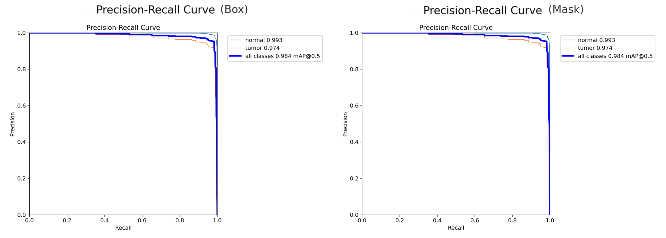 无论是Box还是Mask,模型在本数据集上的表现都极其优异,正常类接近完美 (≈0.993),肿瘤类也保持了较高精度 (≈0.974),整体 mAP 指标达到 0.984,说明模型具有良好的分类与分割能力。