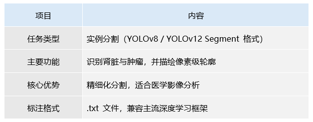 摘要:本信息集包含腹部肾脏 CT 影像及其对应的分割标注,旨在支持 肾脏与肾脏肿瘤的自动分割研究。数据集共囊括 3921 张图像,划分为训练集、验证集和测试集,并提供与之对应的 YOLOv8、YOLOv12实例分割格式标签。标注区分 两类目标:肾脏正常(Normal)与肾脏肿瘤(tumor),可用于训练和评估分割模型。