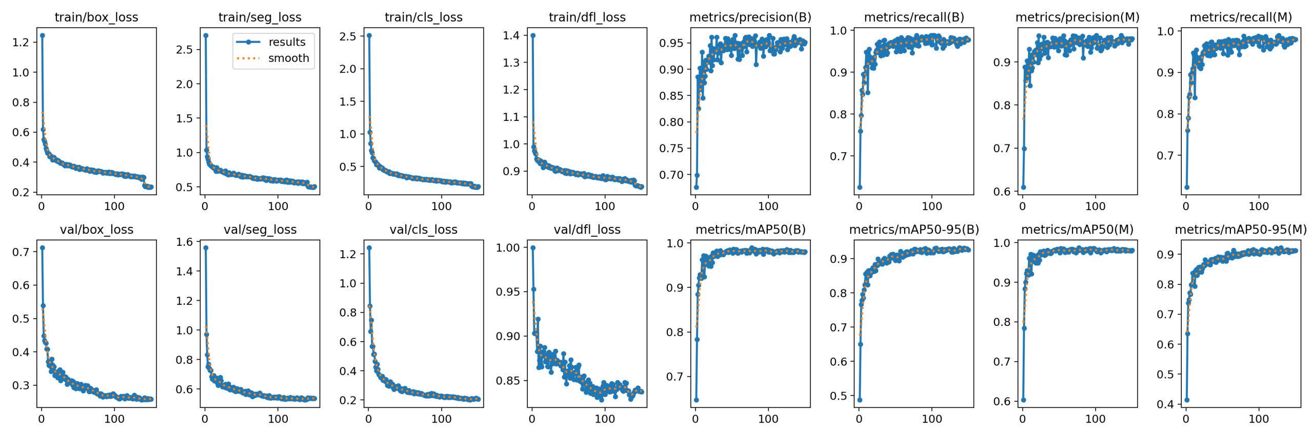 该图展示了 YOLO 模型在信息集上的训练与验证过程,损失函数逐步下降并趋于平稳,同时验证集上的精度、召回率和 mAP 指标不断提升并稳定,表明模型收敛良好并具备较高的分割性能。