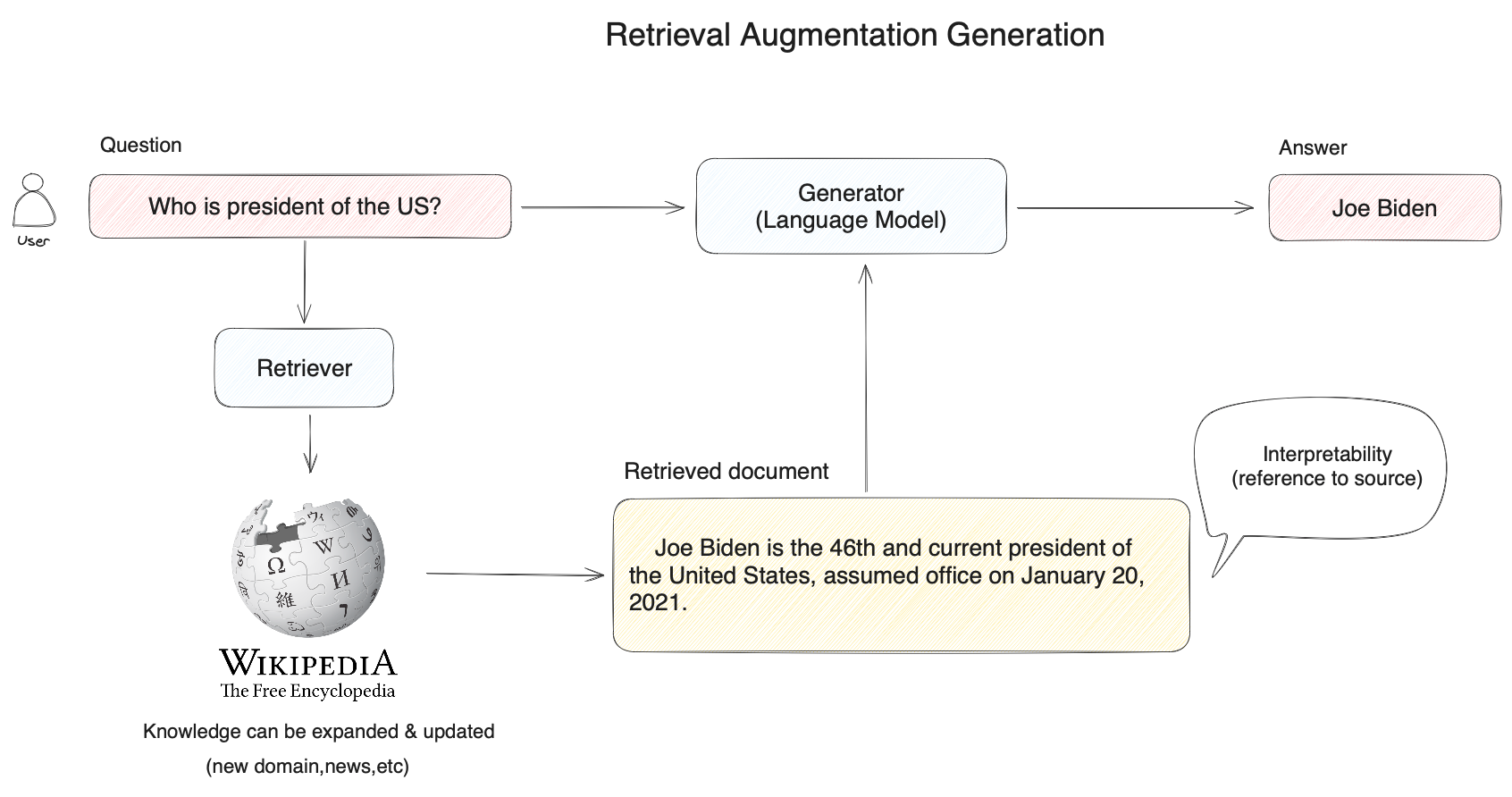 - RAG 技术思路:先将用户的困难在知识库(如下图中的维基百科)中进行向量搜索,通过语义相似度匹配的方式查询到相关的内容(拜登是美国现任第 46 届总统),然后再将用户问题及搜索到的相关知识提供给大模型,使得大模型获得足够完备的知识来回答问题,以此获得更可靠的问答结果。