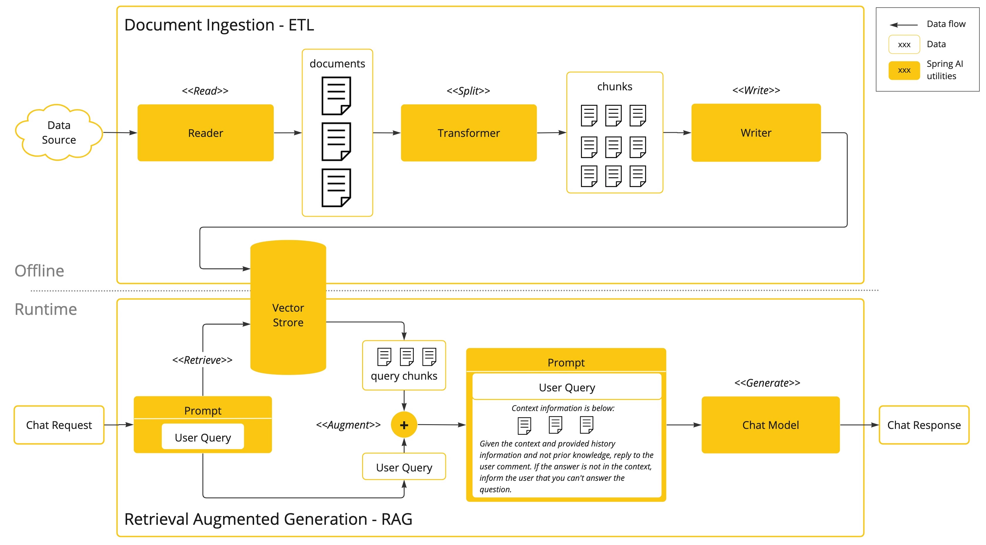 首先,使用 Reader 从 Data Source 中读取文档,并利用 Transformer 将其分割为若干个 chunk 分块(原来的文档太大,得拆分为更小的部分)。然后,利用 Writer 将 chunk 分块数据写入到向量数据库(Vector Store)中。